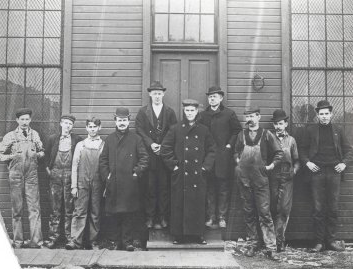 Born in Mason County, West Virginia in 1859, Owens left school at the age of 10 for a glassware apprenticeship in Wheeling. Within five years, he became a master glassblower. He moved to Toledo in 1888 to work for Edward Drummond Libbey. Pictured here (center) with other Toledo glassworkers, Owens was eventually appointed as foreman and supervisor and went on to build machines that could automate the production of glass containers and eliminate child labor in the glass industry. His glass bottle-making machine automated the entire process, from selecting the molten glass to blowing the glass into its final form. The machine produced glass bottles at a rate of 240 per minute, and in some cases, reduced labor costs by 80%. In 1983, the American Society of Mechanical Engineers described the bottling machine as the "most significant advance in glass production in over 2,000 years..." Over the course of his life, Owens secured forty-five patents. He retired in 1919.
