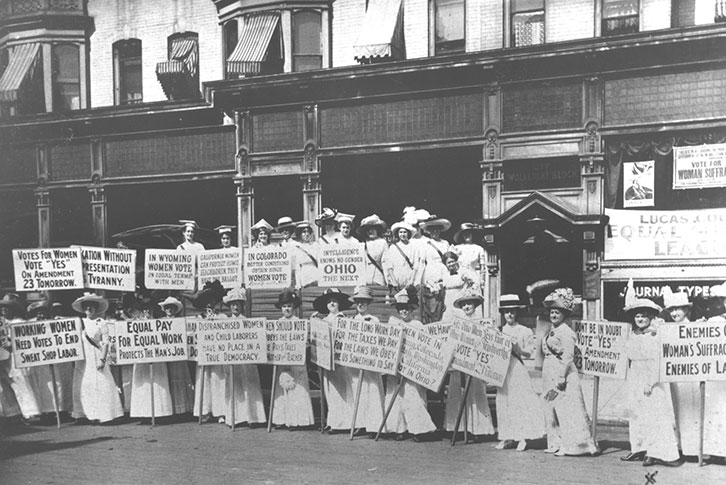 1869: A public meeting is held at Hunker's Hall (on Summit, between Madison and Adams) to draft a constitution for the Toledo Woman Suffrage Association. Many local women helped carry the banner for legal and political equality for women in post-civil war Toledo. This group was active until 1915 when it became part of the Political Equity League. Today, we know this group as the League of Women Voters of Toledo-Lucas County. This photograph is of the Toledo Woman Suffrage Association in downtown Toledo in 1912.